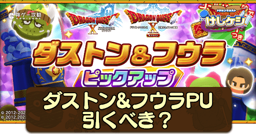 ドラ消し(ドラクエけしけし)における、ドラクエ10イベントの「ダストン&フウラピックアップガチャ」について掲載!ダストン&フウラPUガチャを引くべきかどうかや、ピックアップキャラの評価、ガチャシミュレーターを掲載しているため、ドラ消しでガチャを引く前の運試しにどうぞ。