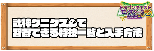 武神クニクズシは、上記のモンスターが所持している。また、上記のモンスターを新生配合で作成すると、武神クニクズシが初期スキルとなる。