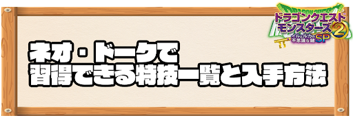 ネオ・ドークは、上記のモンスターが所持している。また、上記のモンスターを新生配合で作成すると、ネオ・ドークが初期スキルとなる。
