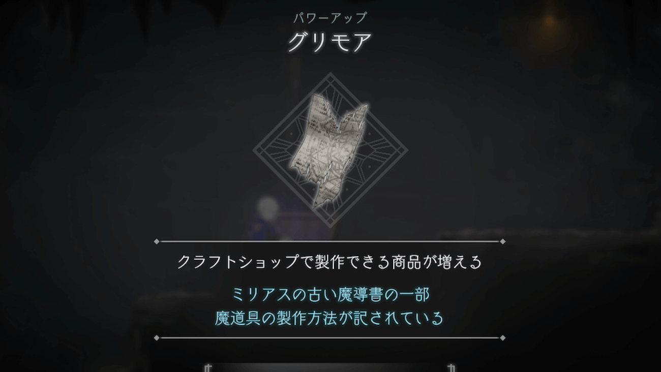 グリモアを入手すると、入手数に応じてクラフトショップの商品が増加する。クラフトショップでは主に防具などを購入できるため、戦闘が厳しくなったら購入に向かおう。