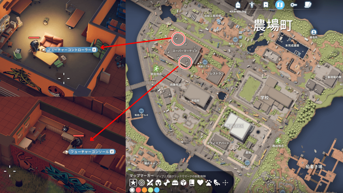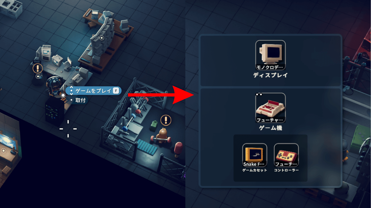 ゲーム機「フューチャーコンソール」「フューチャーコントローラー」はスーパーマーケット内のレジ前と、スーパーの小部屋のカギで入れる部屋に確率で出現。カギ未入手の場合は、ゲーム機を探すのと平行しつつ、服装を探してカギを探すと効率が良い。