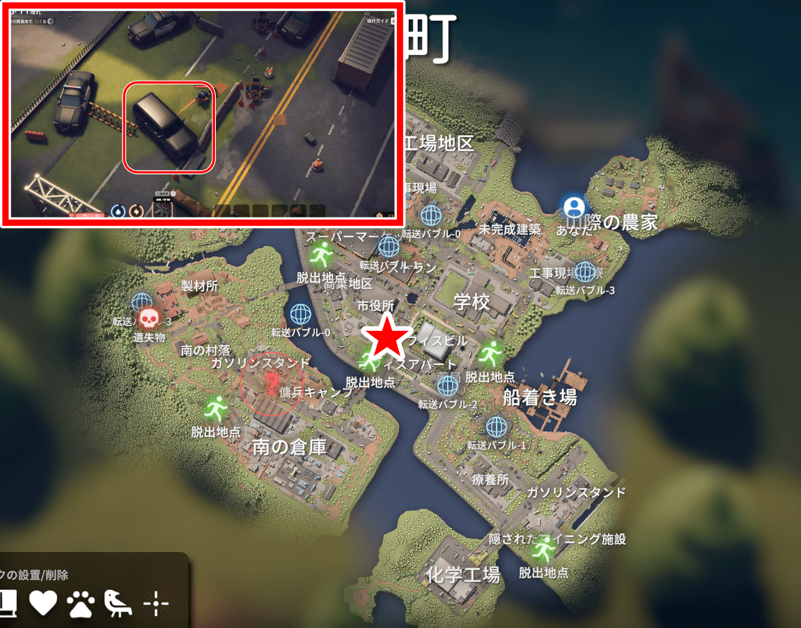 愛車を探せは、農場町中央エリアの市役所付近にある、黒い車にマップマーカーを設置すればクリア。マーカー設置には10秒程度かかるため、あらかじめ周囲の敵を倒して安全を確保しておこう。