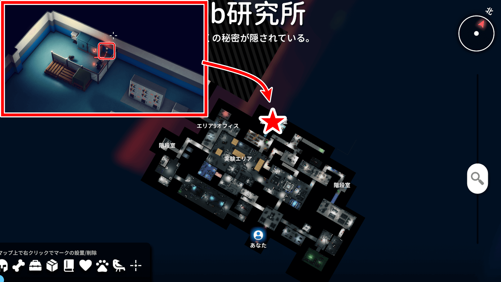 マップ上で赤くなっている辺りから水浸しで感電し始めるため、ゴム作業服に着替えて進む。奇妙な実験エリアでは敵は出現しない。