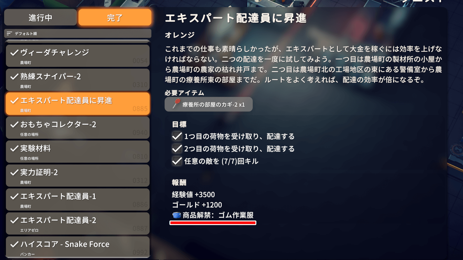 防御フィールド-3は、ゴム作業服が必須だ。ゴム作業服は「エキスパート配達員に昇進」をクリアすると販売されるようになるため、まずは該当クエストを行おう。なお、ゴム作業服は防御力が低いため、必要になったタイミングで着替えるのがおすすめ。