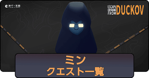 エスケープフロムダッコフでミンから受けられるクエストについて掲載。ダッコフでの各クエストの解放条件や内容、報酬についても一覧形式で解説。ダッコフでミンのクエストを知りたい時の参考にどうぞ。