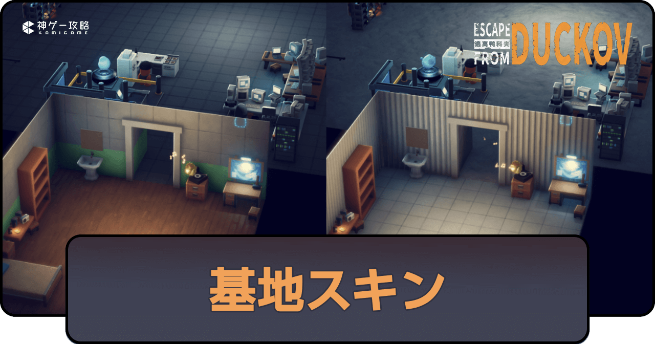 エスケープフロムダッコフの「基地スキン」について掲載。基地スキンの設定方法のほか、スキン変更に必要なアイテムの入手方法や購入時の必ゴールドについてもまとめて解説。基地スキンについて知りたい時の参考にどうぞ。
