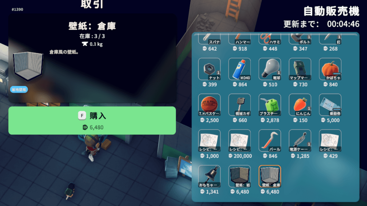 基地スキンの変更に必要な壁紙は、自動販売機にて購入できる。購入できるのは「倉庫」と「岩」の2種類だ。
