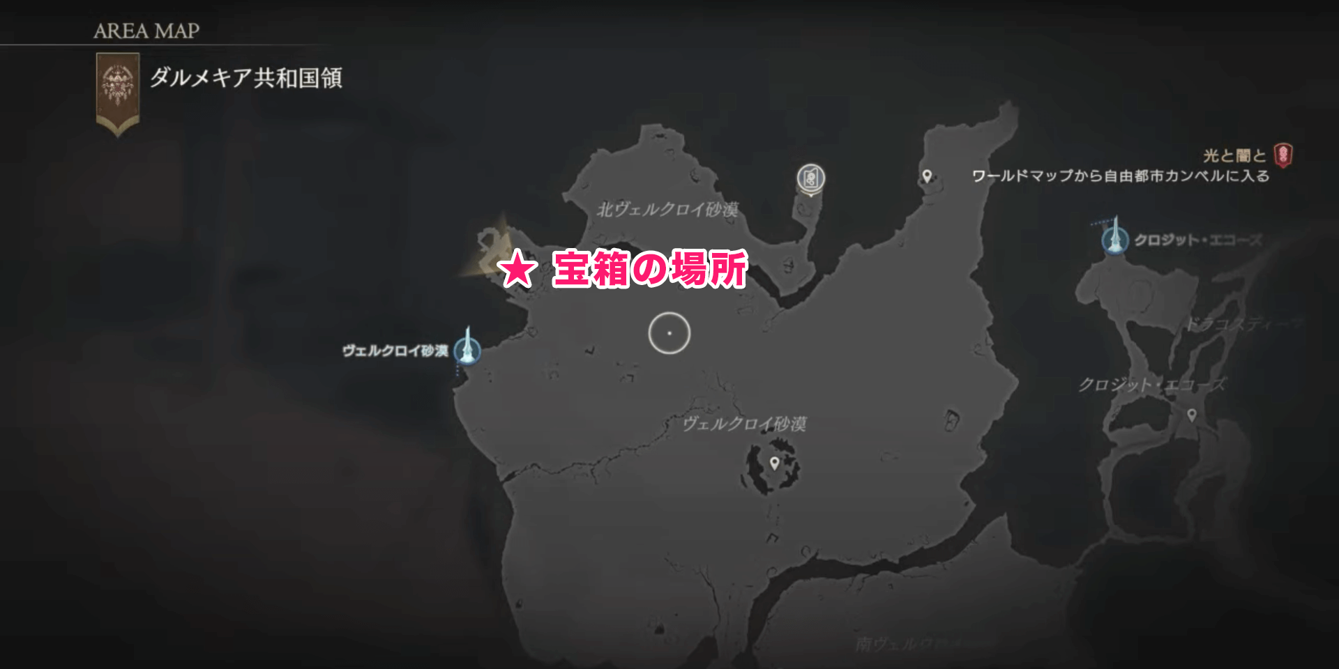 FF16におけるヴェルクロイ砂漠について解説。マップや入手アイテム、宝箱と出現モンスターについても掲載しているので、ファイナルファンタジー16をプレイする際の参考にどうぞ。