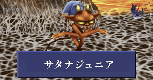 FF4(ファイナルファンタジー4)のモンスター「サタナジュニア」のステータスと出現場所を紹介。HPや弱点、獲得経験値や入手ギルをまとめて掲載。ドロップするアイテムや盗めるアイテムも紹介しているので、攻略の参考にどうぞ。