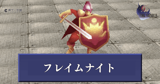 FF4(ファイナルファンタジー4)のモンスター「フレイムナイト」のステータスと出現場所を紹介。HPや弱点、獲得経験値や入手ギルをまとめて掲載。ドロップするアイテムや盗めるアイテムも紹介しているので、攻略の参考にどうぞ。