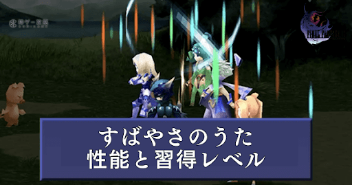 FF4(ファイナルファンタジー4)の歌「すばやさのうた」の性能と習得キャラを紹介。習得するレベルや条件、詠唱時間、命中率も掲載しているので、歌を使う際の参考にどうぞ。