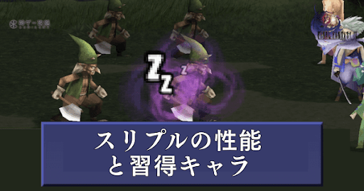 FF4(ファイナルファンタジー4)の黒魔法「スリプル」の性能と習得キャラを紹介。習得するレベルや条件、詠唱時間、命中率も掲載しているので、黒魔法を使う際の参考にどうぞ。