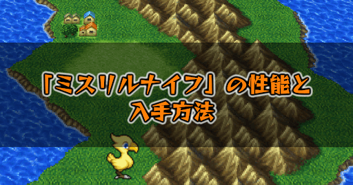 FF5(ファイナルファンタジー5)の「ミスリルナイフ」の性能と入手方法について掲載。「ミスリルナイフ」を盗めるモンスター、ドロップするモンスターの他、おすすめの使用方法についても掲載しているので、攻略の参考にどうぞ。
