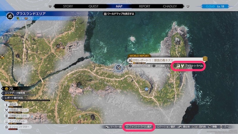 討伐拠点やライフスポットなど、ワールドレポートで調査する場所にもファストトラベルできる。調査するとパーティ経験値やクラフト素材が手に入るなどのメリットがあるため、新エリアについたら各ワールドレポートを進めると良い。