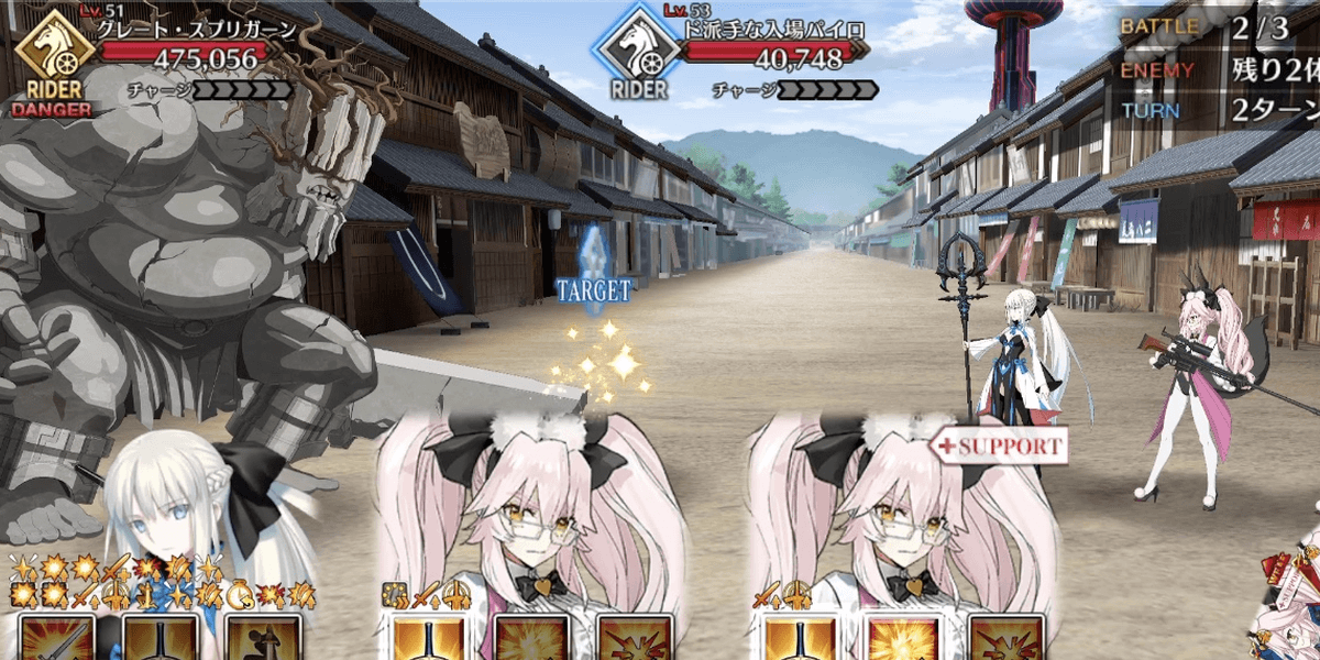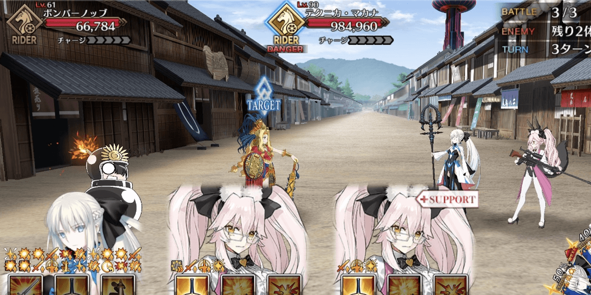 ・宝具+追撃で突破 ※低乱数だと10万ほど残るため、クリティカル可能な信長/ワルキューレカード優先 |