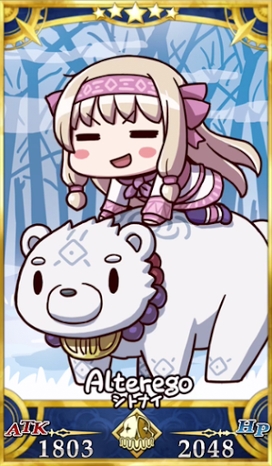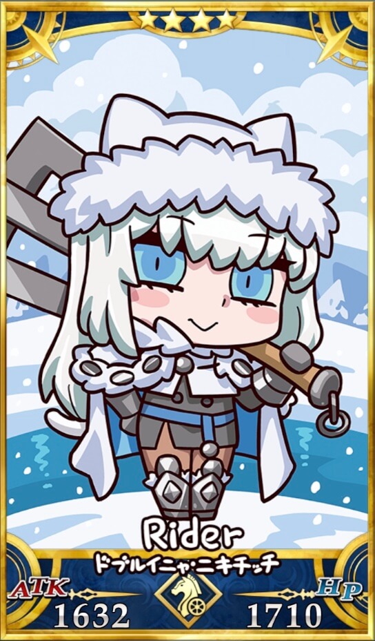 | めがみサーヴァント 3つの女神が合体して生まれたかわいい雪ん子サーヴァント。ペットのしろくまに乗って襲ってくる。魔法少女イリヤと同じ種族のようだが詳細は謎だ。 |