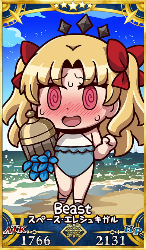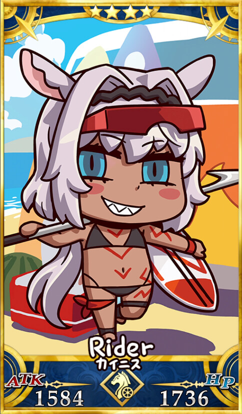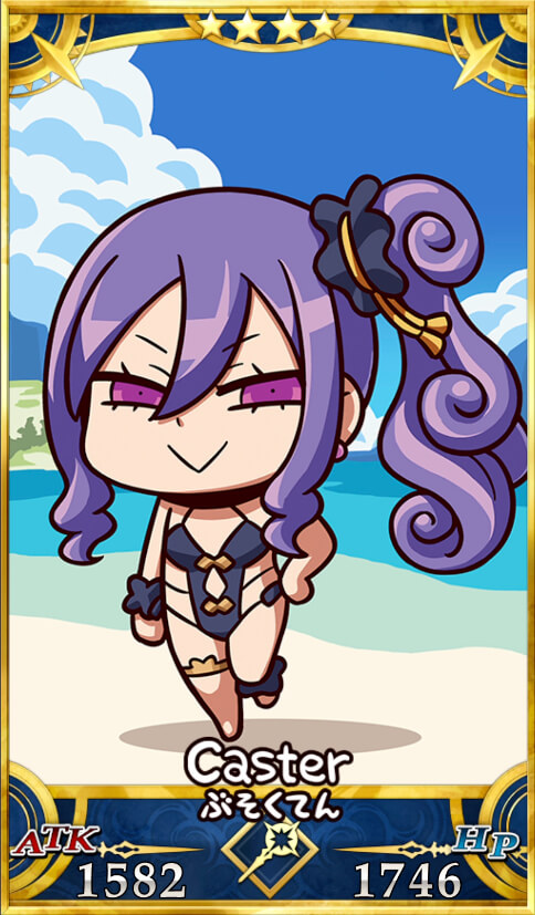 | じょおうサーヴァント 魅惑の水着姿でさらにセレブ感が増した女王メイヴ。ビーチで彼女に声をかけられたら最後、あなたもグッドルッキングブレイブの仲間入りだ。 |