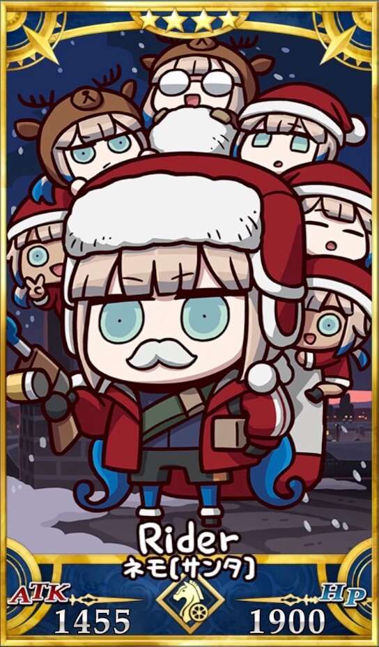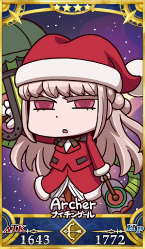 かんごしサーヴァント バーサーカーじゃなくなっても相変わらずおかしい看護師さん。サンタさんの姿で空から舞い降り、良い子にも悪い子に分け隔てなく痛い注射を打ってくれる。 |