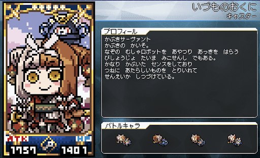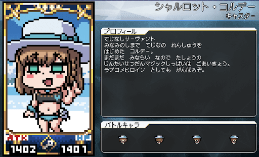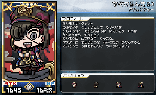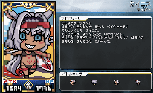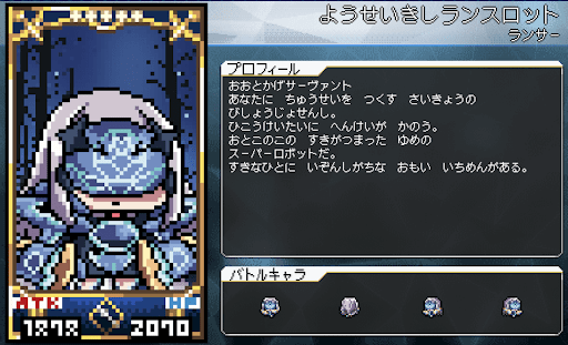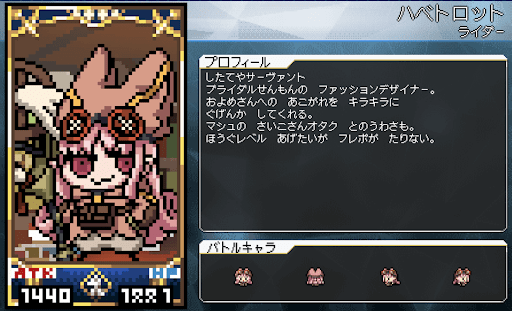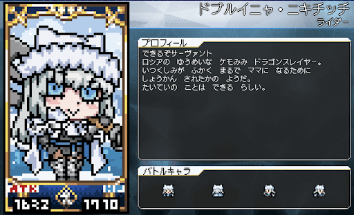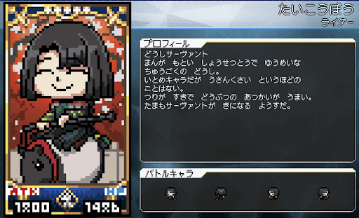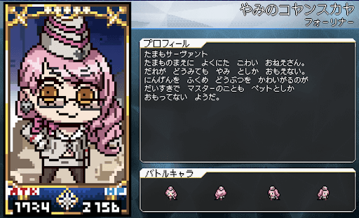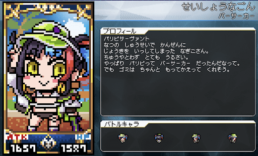 | ぶしょうサーヴァント がんばりやのおねえさんサーヴァント。まじめな優等生タイプ。同期が超絶変人ばかりなので苦労させられるばかりか影も薄くなりがちな不遇美少女だ。 |