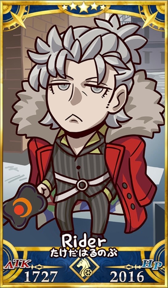 ぐんしんサーヴァント 戦国時代を代表する最強の武将。職場ではいつでもニコニコ笑顔を絶やさないが、つねにアルコールが入っているせいかもしれない。 |
