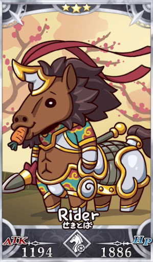 | うまサーヴァント 人馬一体の呂布から呂布成分を引いた状態の100%馬サーヴァント。自分を呂布だと信じ込んでいる。本当のことを言ってあまり刺激しないようにしよう。 |