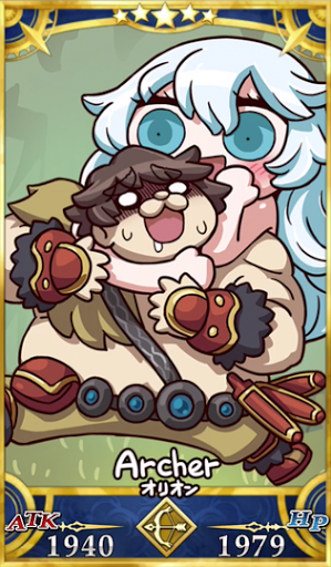 くまくまサーヴァント くまのぬいぐるみから真のムキムキ筋肉マッチョの姿に戻ったオリオンだ。中身はほぼそのままだ。アルテミスは相変わらずダーリンをシメる気まんまんだ。 |