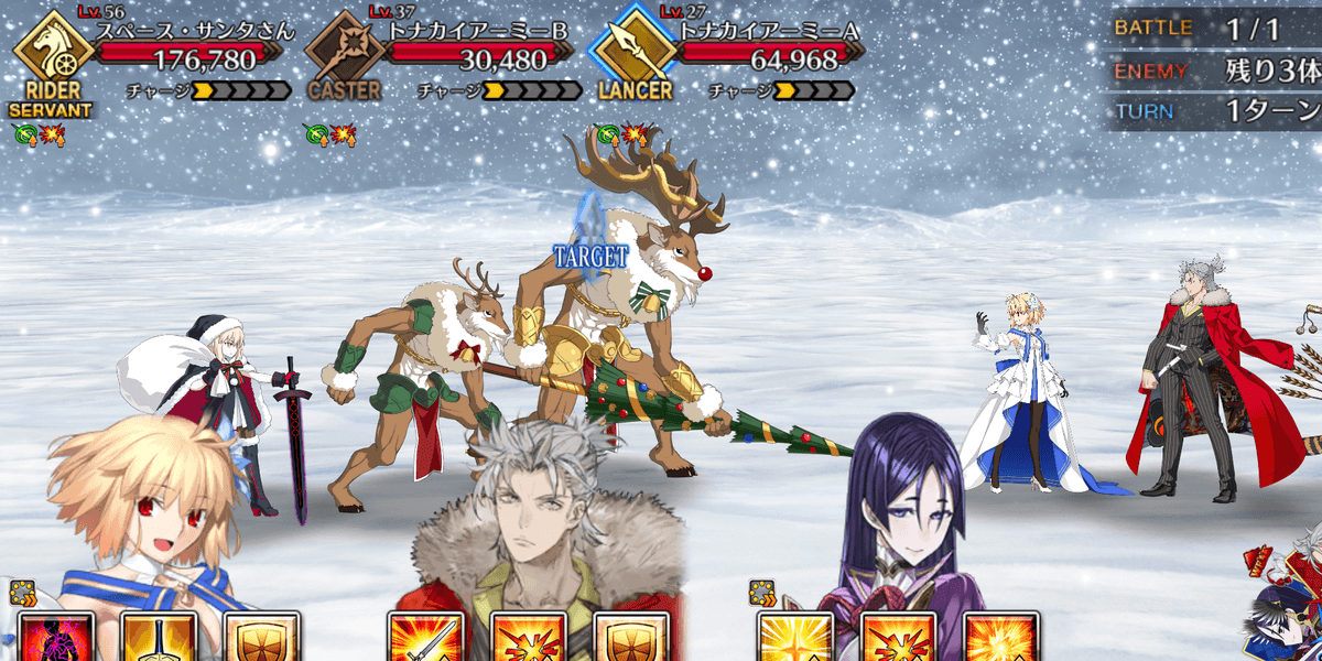 スペース・サンタさんは他の敵よりHPが高く、攻撃を強力なため、優先的に倒そう。全体宝具のバーサーカーなら、取り巻きと同時に一掃可能だ。
