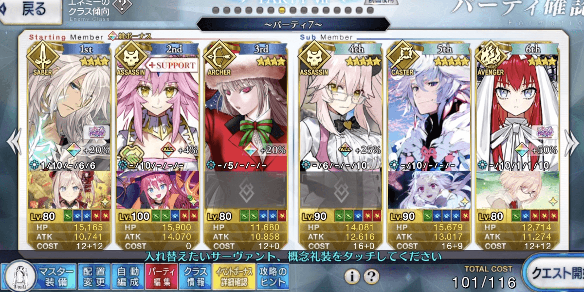 細かいギミックが不明であったため、強化解除耐性アップ補助としてサンタ婦長を加えているが、強化解除のギミックはボスのブレイク2回目に存在するものの、発動確率は50%と中確率だ。そのため、強化解除対策の代わりに、NP供給や強化解除、弱体解除役を加えた方がスムーズな攻略ができる。