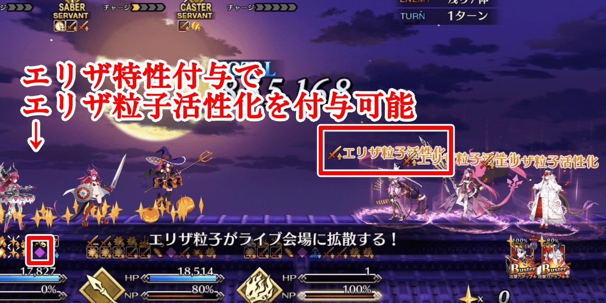 | 開始時 | 【エリザ粒子活性化】 ・控え含む敵と味方のエリザベート特性持ちに解除不可の永続バフ付与 ・攻撃力アップ(5%) ・防御力アップ(3%) ・宝具威力アップ(5%) ・最大HPアップ(3,000) |
