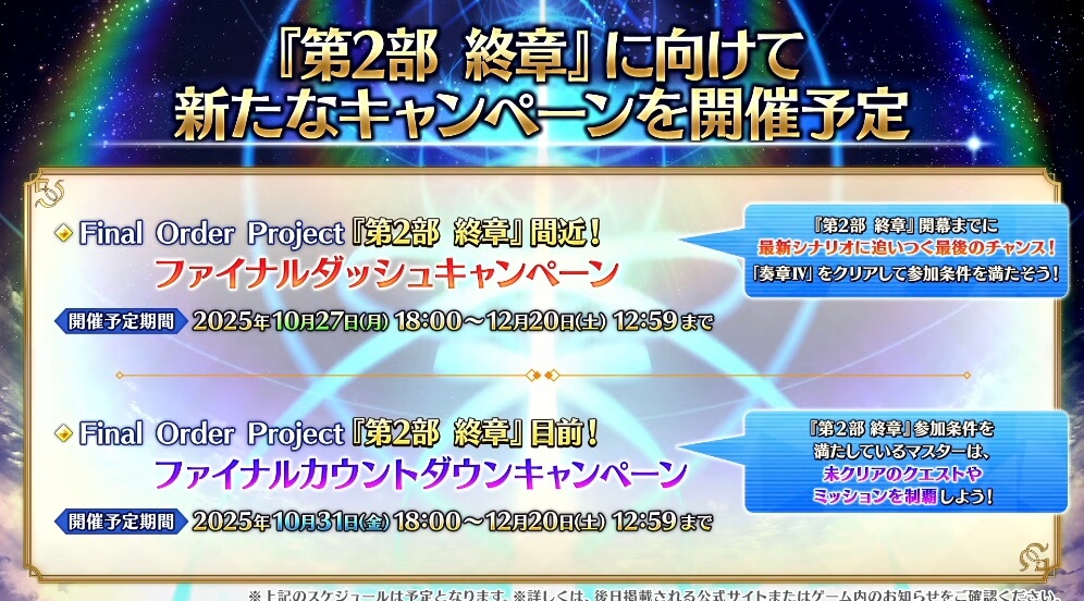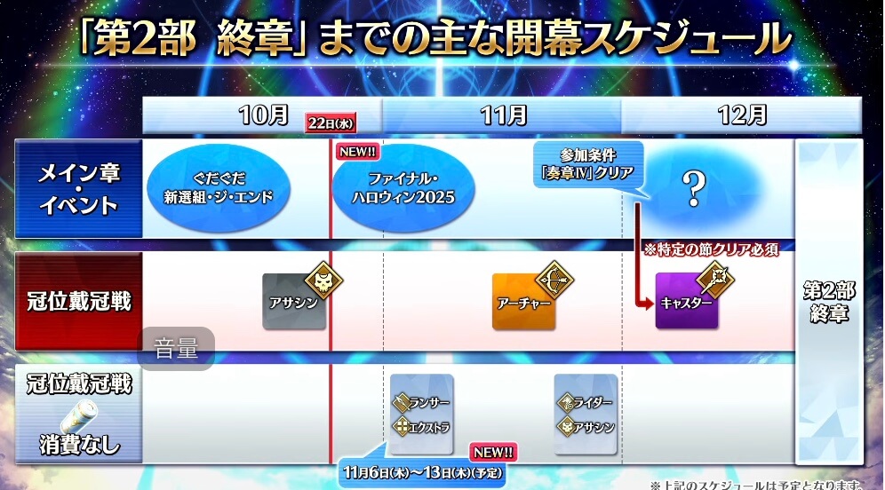10月末から、終章に備えて複数のキャンペーンが開催予定だ。さらに、新規情報として「冠位戴冠戦キャスター」は、直前に開催されるメイン章「?」の進行が必須となる。