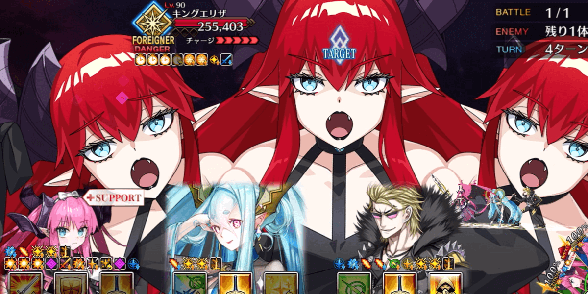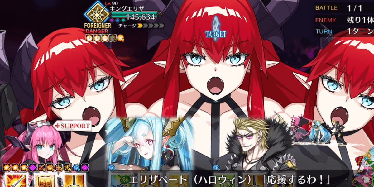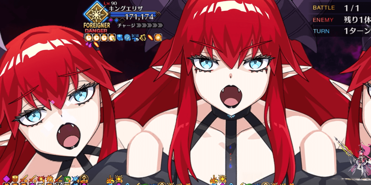 | ギミック | ・各敵の登場と退場時に敵味方全体のエリザベートにバフを付与 ・ボスはブレイクでレアリティが変化 ・解除可能な無敵やガッツなどのバフ多数 ・ボスの登場時混乱&宝具封印、2ブレイク目のスタンが厄介(無効・解除が有効) |