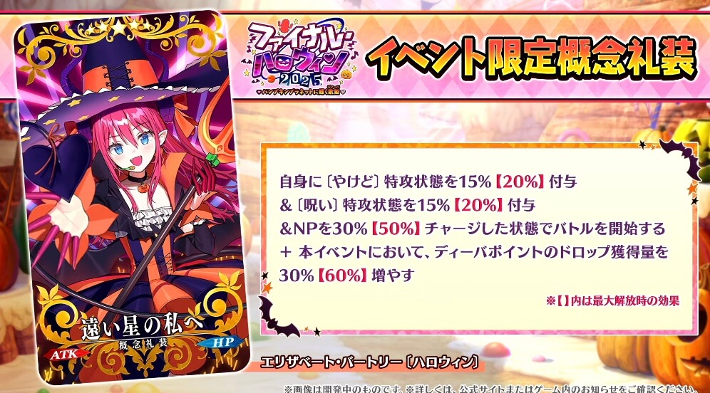 ハロウィン2025の配布サーヴァントとして「終わりのエリザベート」が獲得できる。獲得にはイベントクリアが必須で、仮加入などは行われないようだ。また、終わりのエリザベートは、アヴェンジャークラスで実装される。