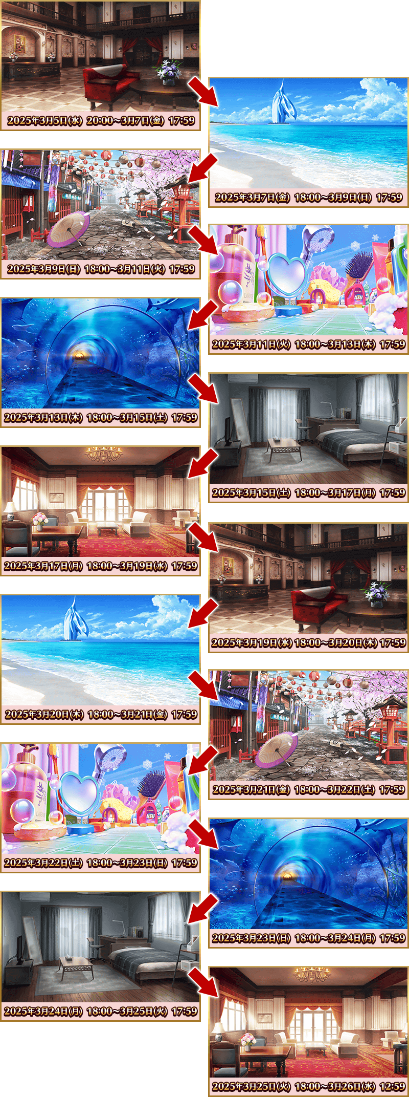 3月5日(水)20:00~3月26日(水)12:59・マイルームで1~2ショット撮影機能解禁 ・組み合わせにカルデアスタッフ追加 ・撮影時のフレームも選択可能 ・期間中のマイルーム背景がローテで変化 |