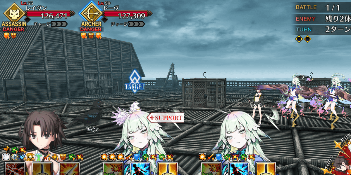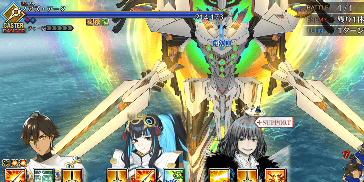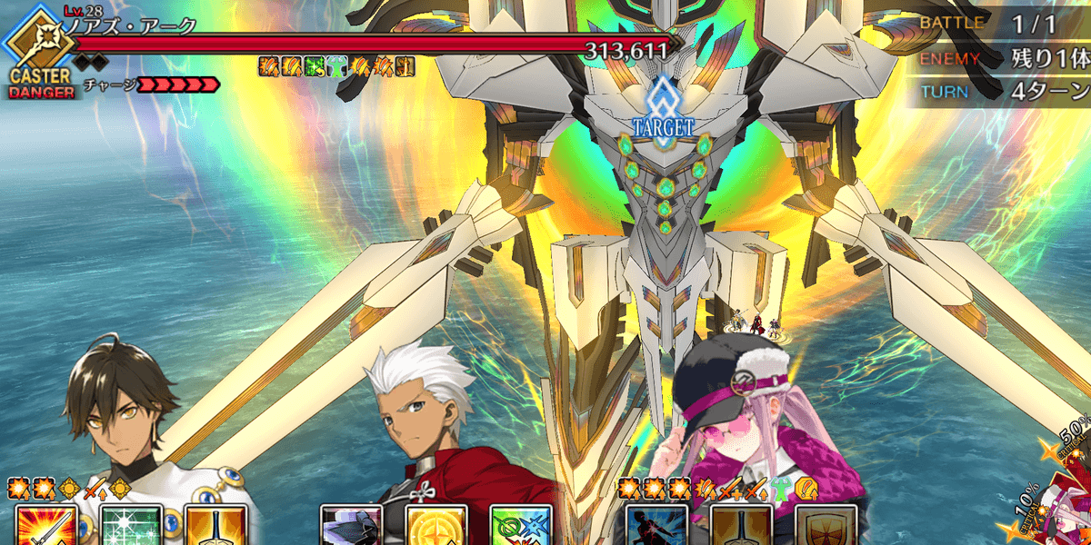 | ギミック | ・選択肢によってギミック追加 ・「殺さないで」を選ぶと宝具使用不可(永続) ┗毎ターンスター獲得(永続) ┗ダメージカット付与(永続) ・敵全員攻撃& クリ発生率アップ |