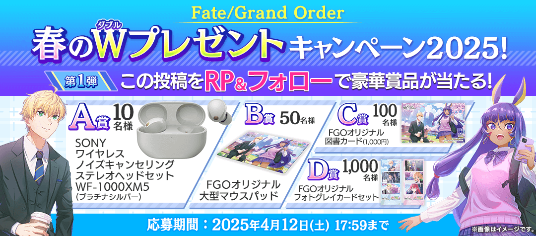 FGOのX(旧Twitter)公式アカウントをフォロー&リポストで、抽選で景品が当たるキャンペーンが開催される。第1弾は実在のグッズ、第2弾は合計リポスト数に応じて、ゲーム内で呼符などが配布される。