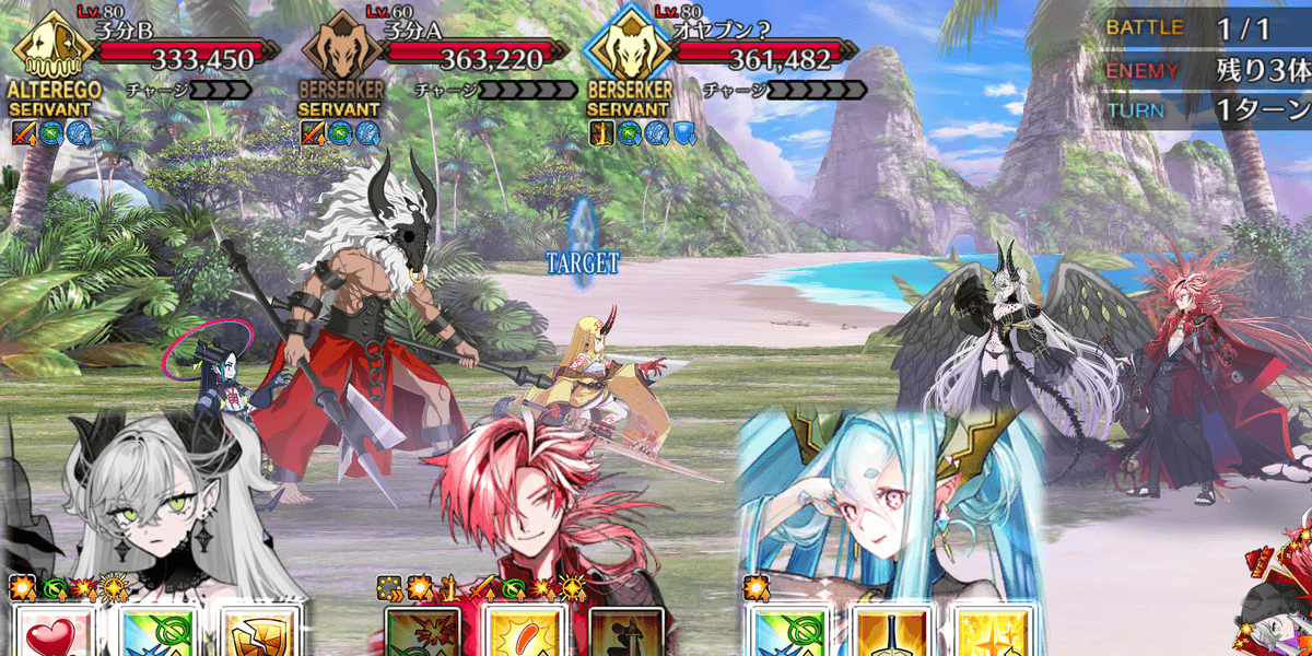 高火力の全体攻撃宝具持ちで一気にダメージを与えるのがおすすめ。茨木童子は子分が倒されない限りガッツで復活しづけるが、被ダメージが軽減されるわけではないため、全体攻撃宝具でダメージを与え続ければ、子分が倒れるタイミングで撃破も狙える。