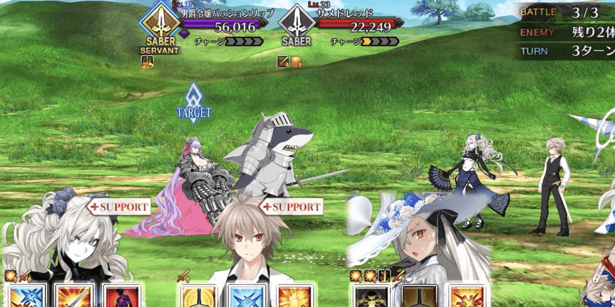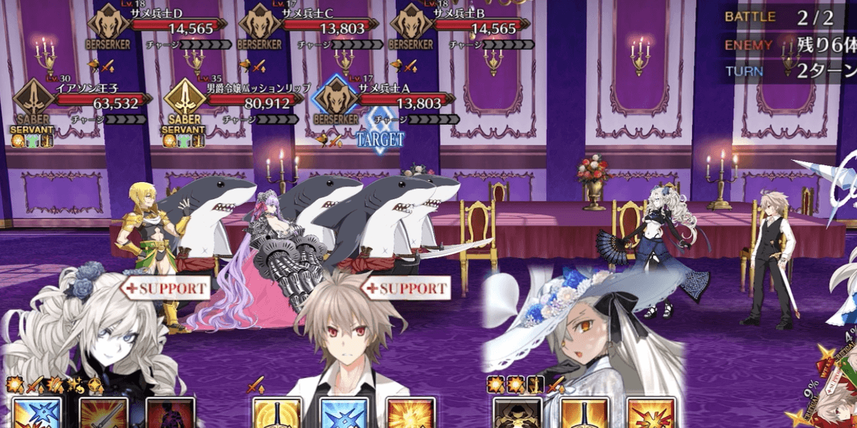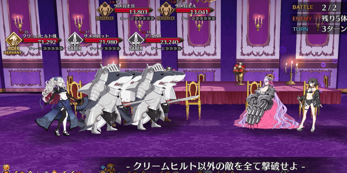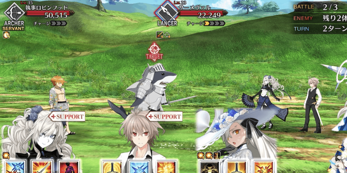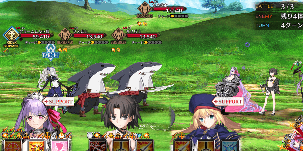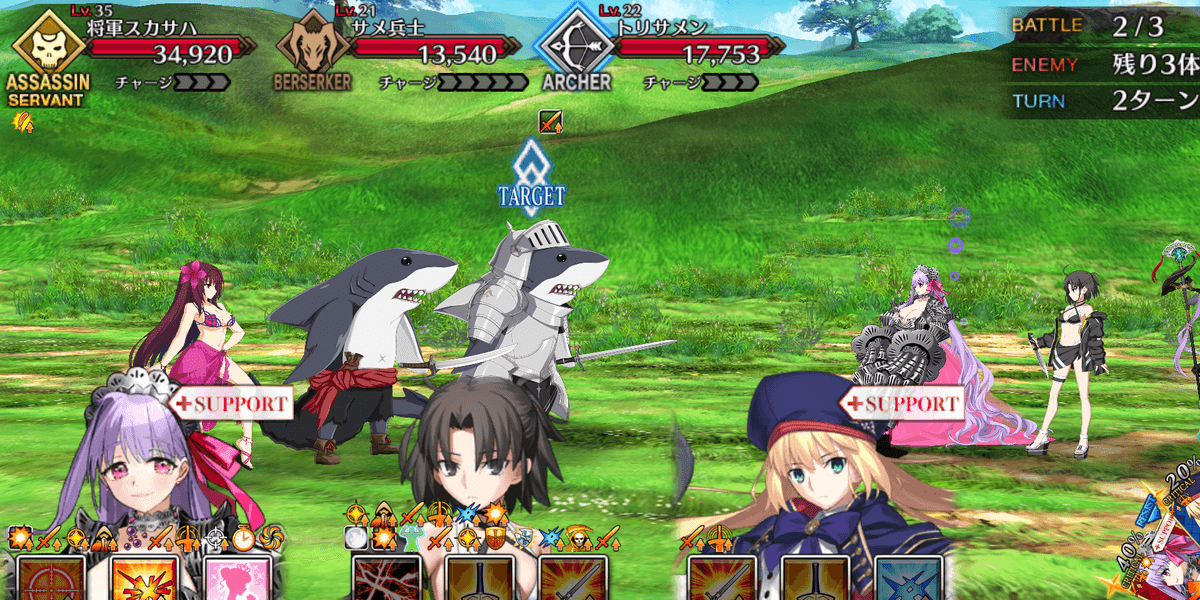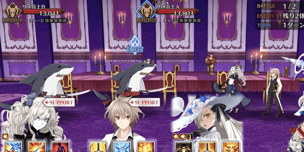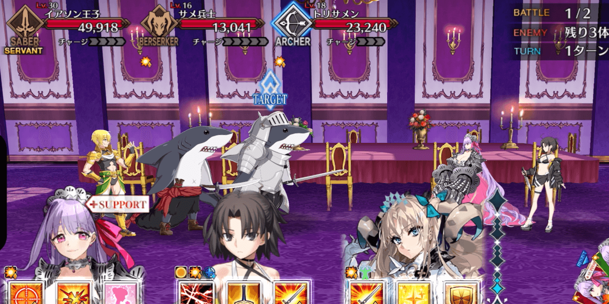 出現する全てのサメ兵士を撃破すればクリアとなるため、全体宝具持ちを編成して一掃するのがおすすめ。サメ兵士はバーサーカークラスで、HPも高くない。手持ちの高倍率NPチャージ持ち全体宝具アタッカーでスムーズに攻略しよう。