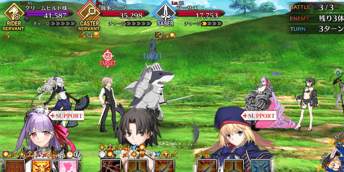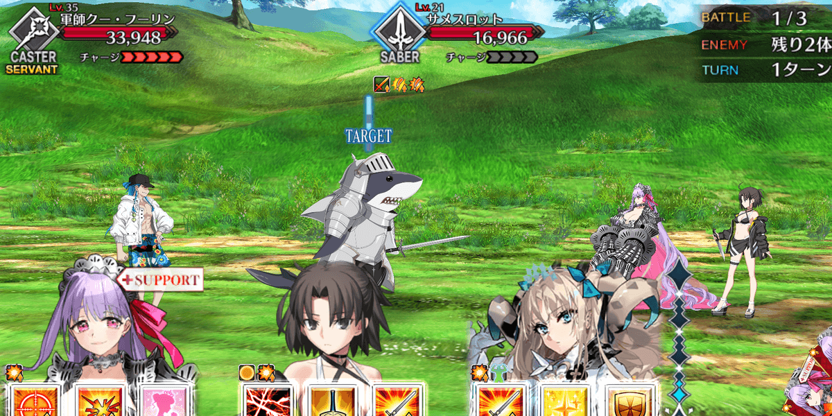 | 敵ギミック | ・サメ騎士系の攻撃力アップ ・開幕時、サメスロットのクリ威力&クリ発生率アップ ・術クー・フーリンのチャージMAX・2WAVE目開始時、水着スカサハのクリ威力アップ・3WAVE目、全体の攻撃力アップ ・アーサメのチャージ増加&超巨大特攻付与 ・ジークにターゲット集中&防御力アップ ・水着ヒルとブレイク時、サメ兵士3体召喚 ・サメ兵士のクリは成立アップ&与ダメアップ |