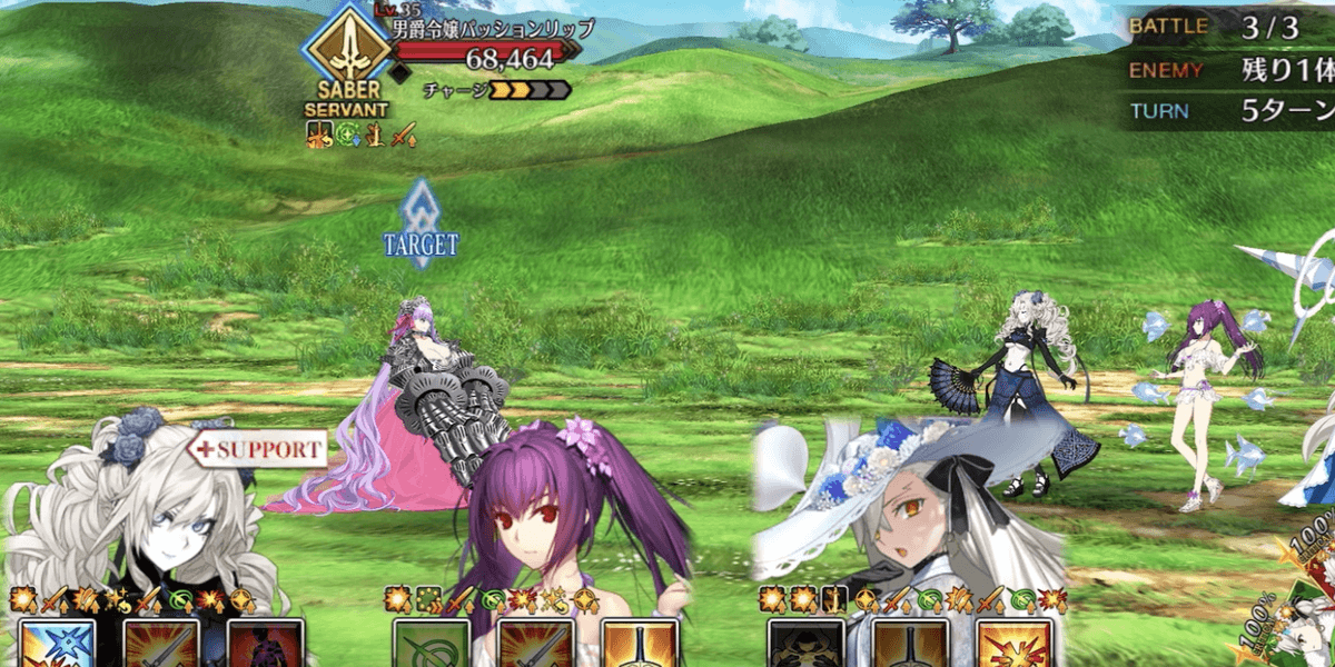 | 敵ギミック | ・開幕、イアソン以外の敵側全てに与ダメ増加付与(500/3T) ・2wave目開始時、水着ヒルトに解除不能な特殊耐性&ガッツ&弱体無効付与 ・敵全体のチャージ1増加&攻撃力アップ ・アーサメ1体に超巨大特攻付与 ・別のアーサメ1体にクリ威力アップ&クリ発生率アップ付与 |