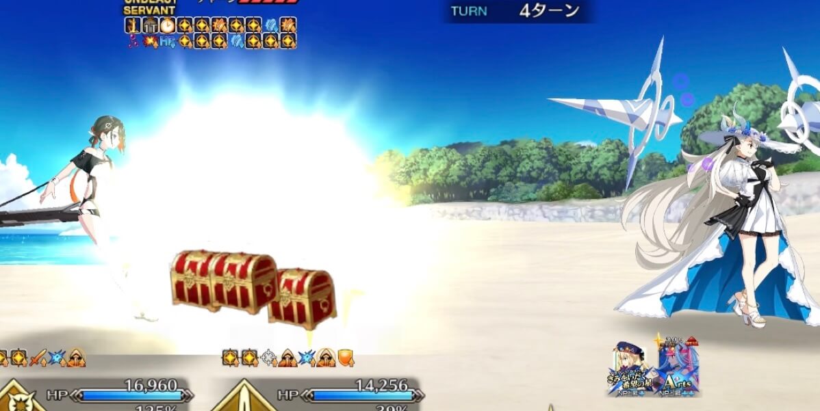 | 開始時 | 【素晴らしきバカンスの続きといこう!】 ・自身の攻撃力アップ(3T/30%) ・宝具被弾で宝具威力アップ(10T/5%)×2 ・クリ攻撃被弾でクリ威力アップ(10T/5%) |
