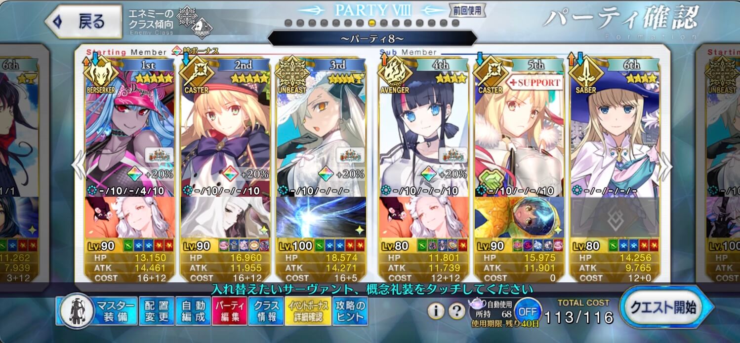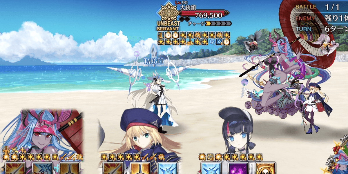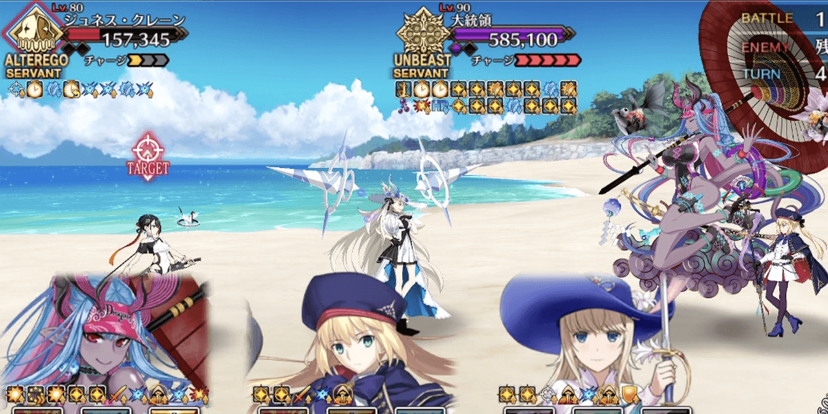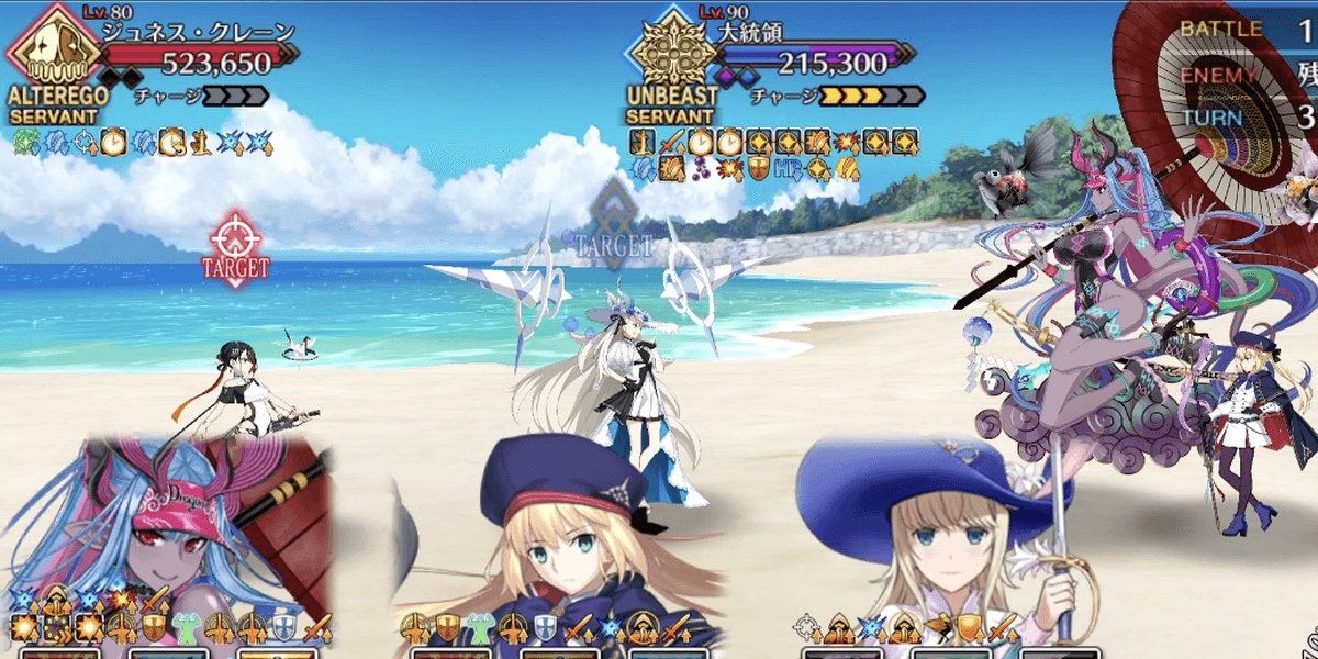 前半はジュネスがタゲ集中や無敵補助と厄介なため、地特攻かつ防御強化解除を持つ水着伊吹の宝具回転で攻めた。大統領単騎後は、クラス相性有利かつ特攻が刺さる水着エリセでゴリ押し。