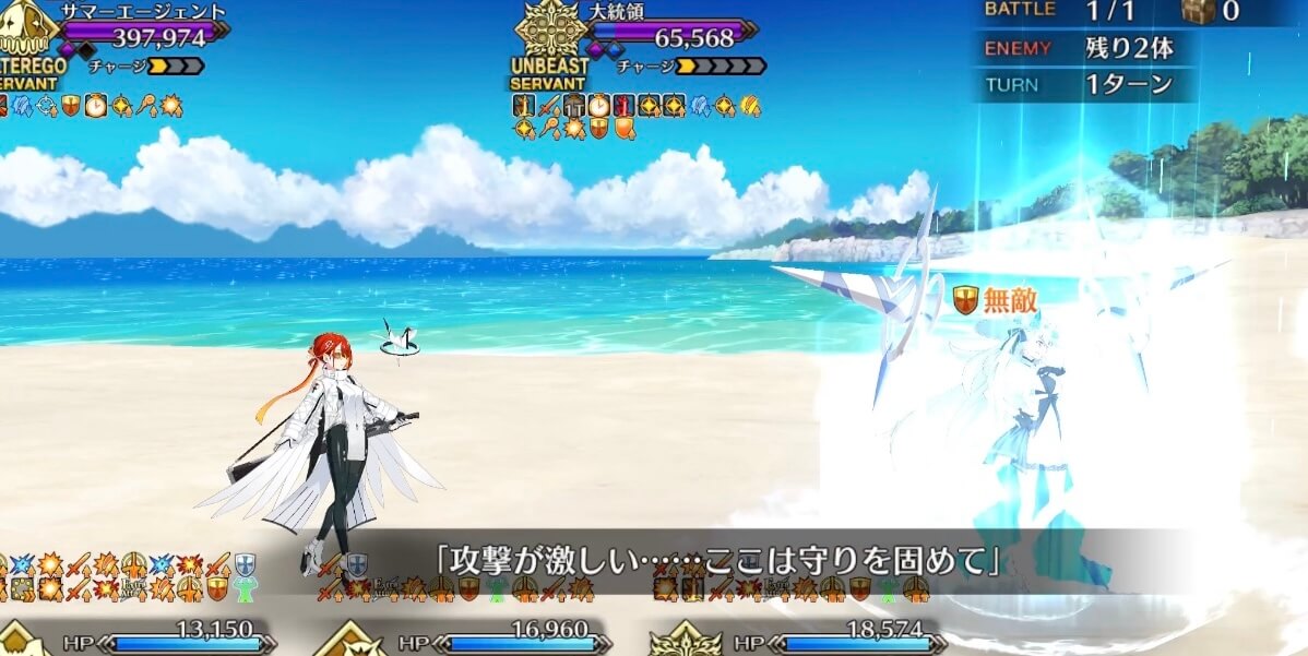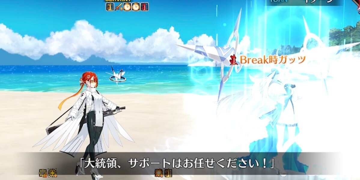 | 開始時 | 【大統領、サポートはお任せください!】 ・大統領にブレイクガッツ付与(3T/2回/50%) ・敵側全体の防御力アップ(3T/30%) ・自身に宝具封印付与(永続) |
