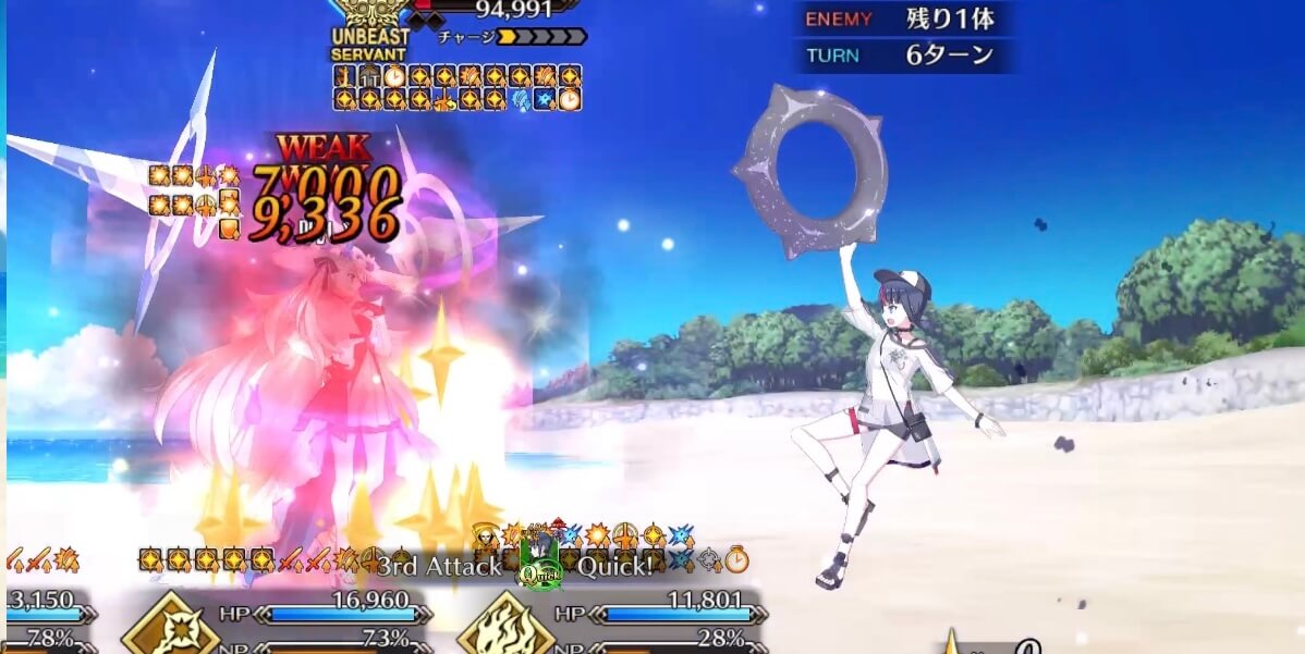 | 退場時 | 【ジュネス、お前も夏を楽しめ】 ・ジュネス生存時のみ発動 ・ジュネスの宝具威力アップ(30%/永続) ・クリ威力アップ(30%/永続) |