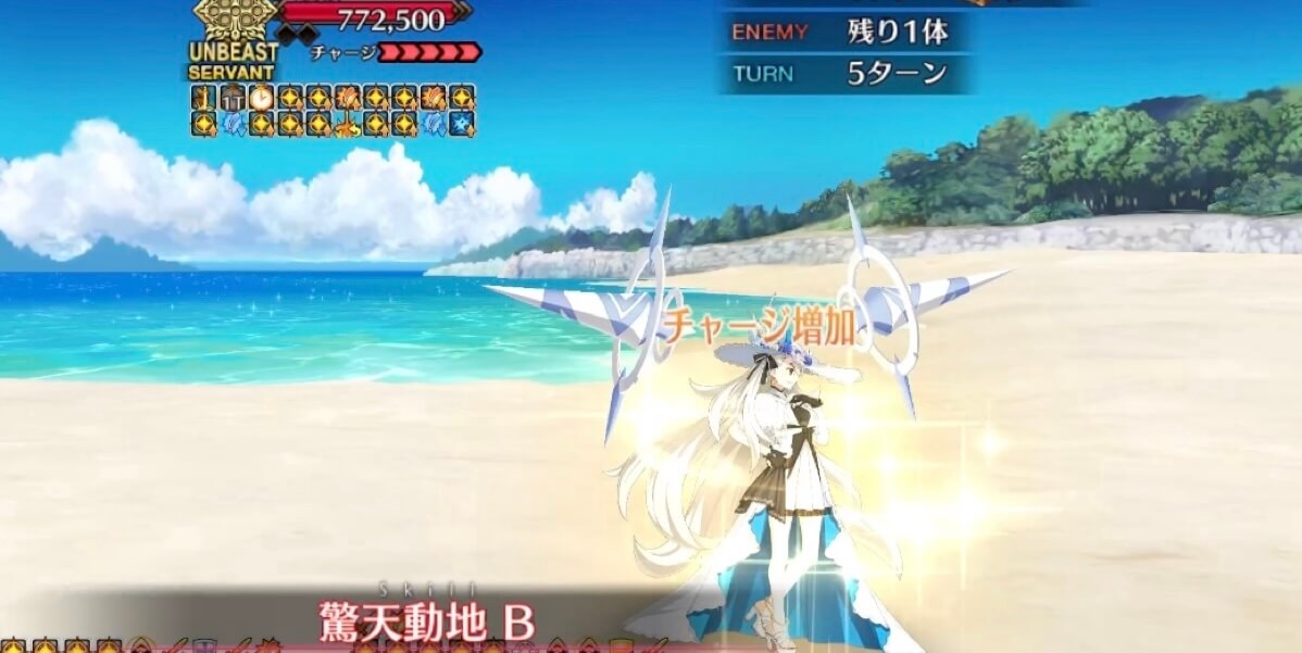 【本気でいくぞ!最高の夏を刻め!】 ・自身の宝具威力アップ(5%/永続)×5※ ・チャージ+2 ┗直後に高確率で「驚天動地」発動=チャージMAX ・毎ターンチャージ+1(5T) ・マスター側全体の宝具威力アップ(5%/永続)×3※ ※大統領に付与されているバフがクリ威力アップの方が多ければ宝具威力→クリ威力アップに変化 |