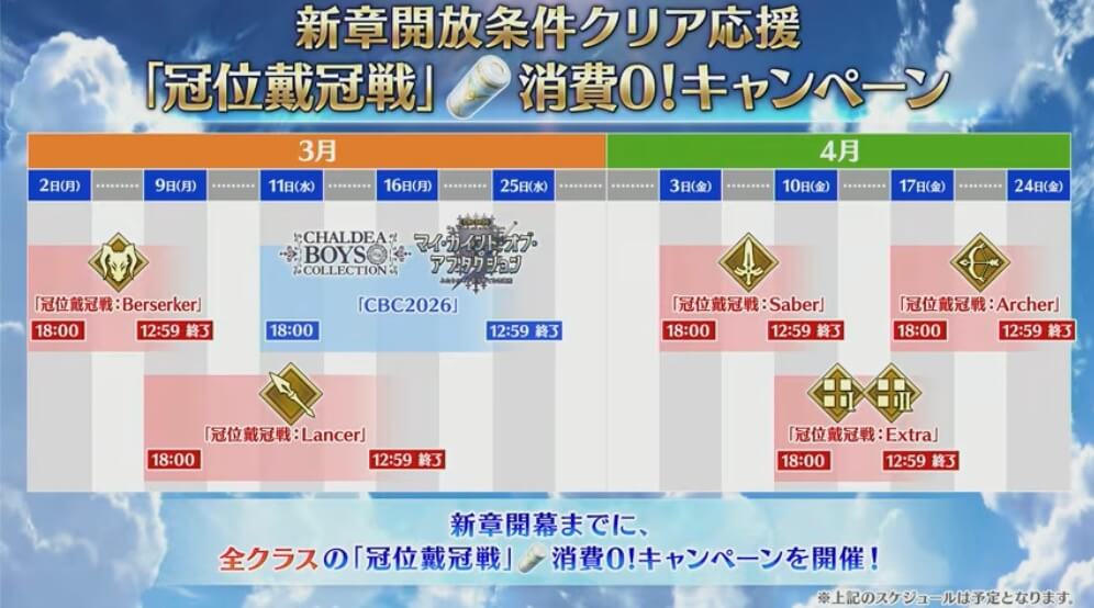 | 新章のストーリーは2026年6月開幕予定3月2日からバーサーカー研鑽戦CP開催3月6日からランサー研鑽戦CP開催 |