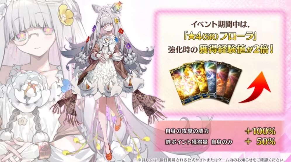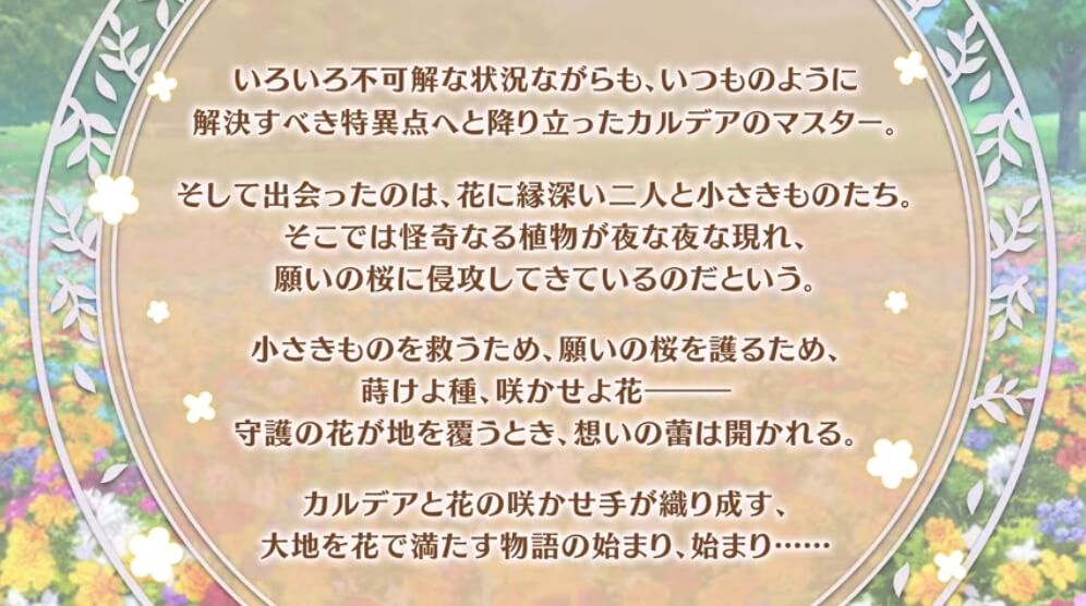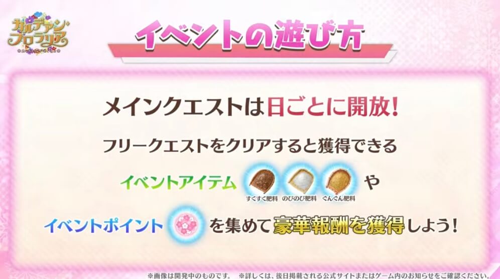 新規イベントはポイント形式、特殊ギミックとして「花畑スキル」が使えるようになる。「花畑スキル」は選んだ花の種類によって変化する。花畑を手入れする「お手入れクエスト」は、朝に開放されるらしい。