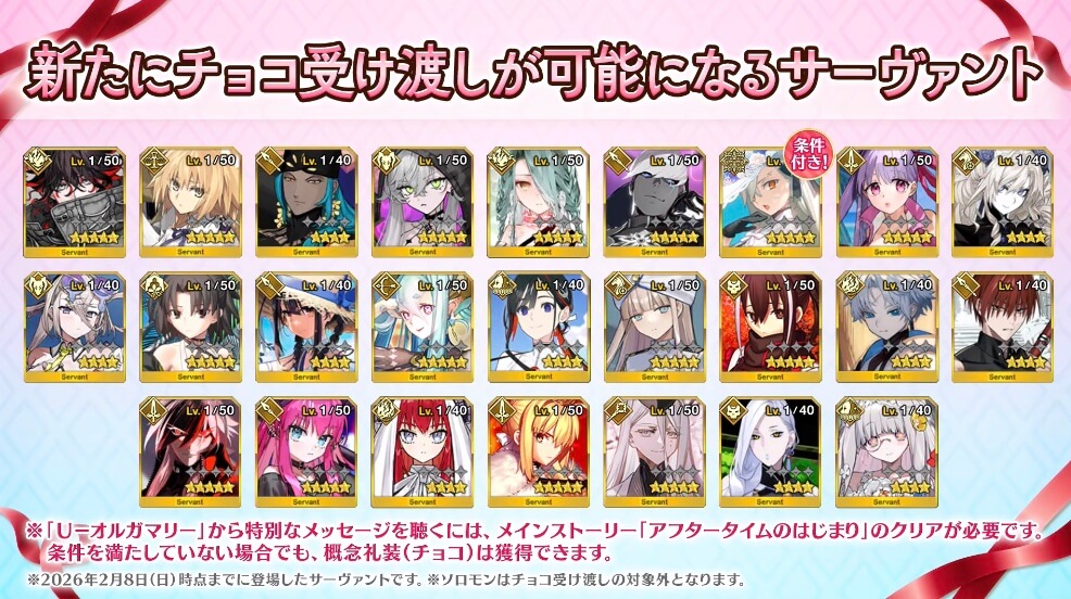 バレンタイン初出のキャラの中で、ソロモンはチョコ礼装の実装が無い。オルガマリーもチョコ礼装とフルボイスイベントの開放には「アフタータイムの始まり」クリアの条件がある。オルガマリーにチョコを渡していた場合、条件達成したタイミングでマテリアルでフルボイスイベントは確認できる。