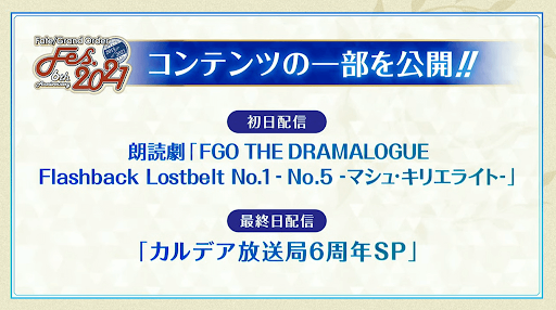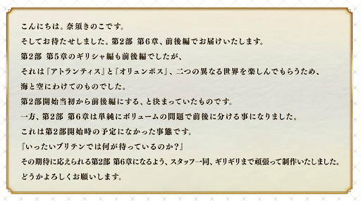 | 配信内容 | ・2部6章の開幕時期を発表 ・2部6章登場サーヴァントの一部を発表 ・2部6章のあらすじを紹介 |
