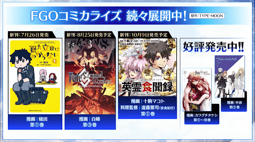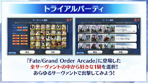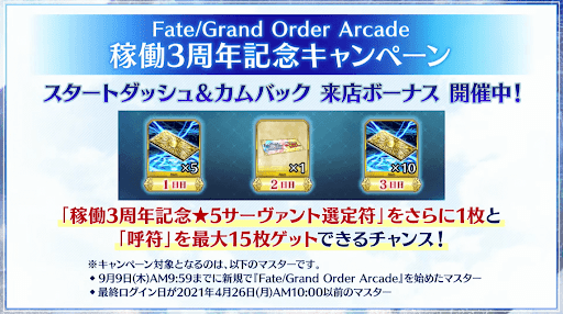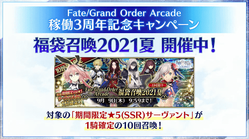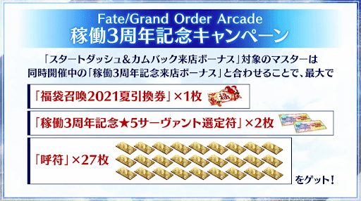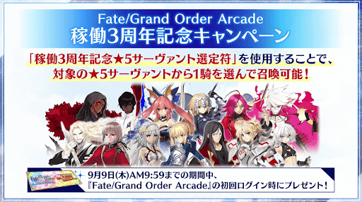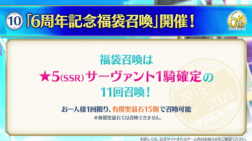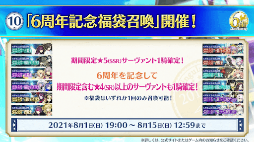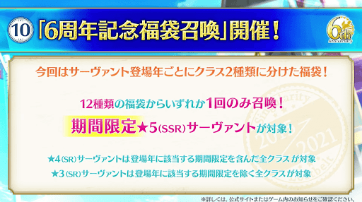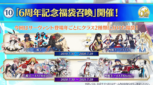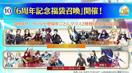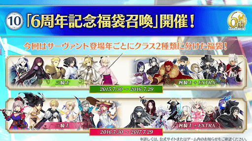 毎年、周年キャンペーン開催時は新規サーヴァントが排出されるガチャも同時に行われる。5周年はキャストリア、4周年はダ・ヴィンチ(ライダー)と周年サーヴァントは例年強力な性能を携えて実装されている。