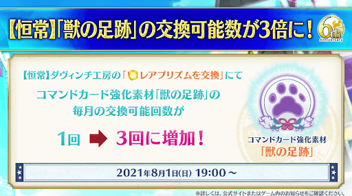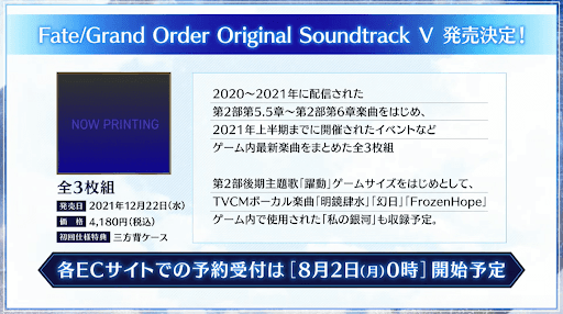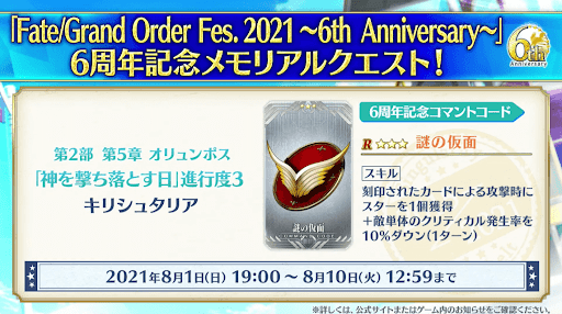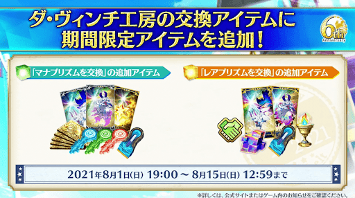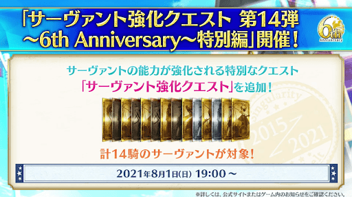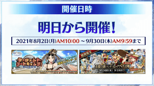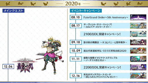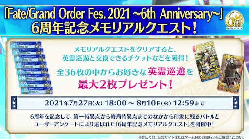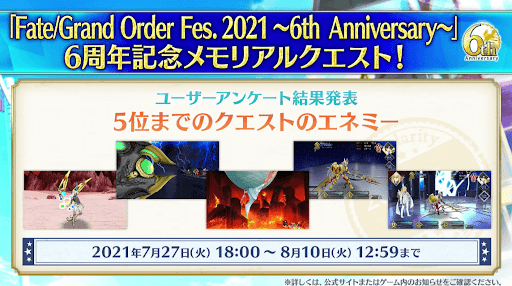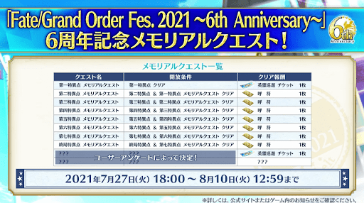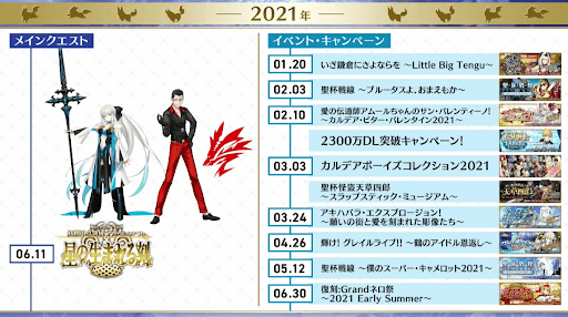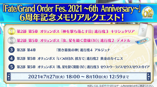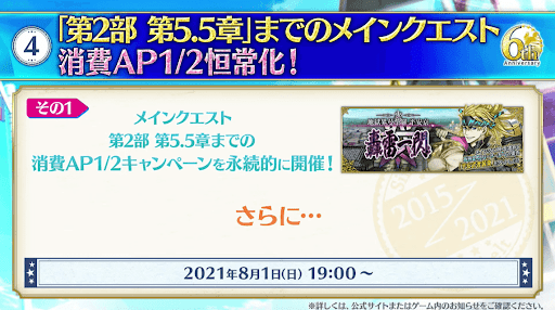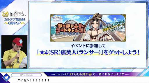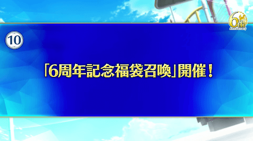 | 放送予定内容 | ・6周年CPの発表 ・新規実装サーヴァントの発表 ・2021年の水着サーヴァント一部発表 ・2部6章関連の新情報発表 |